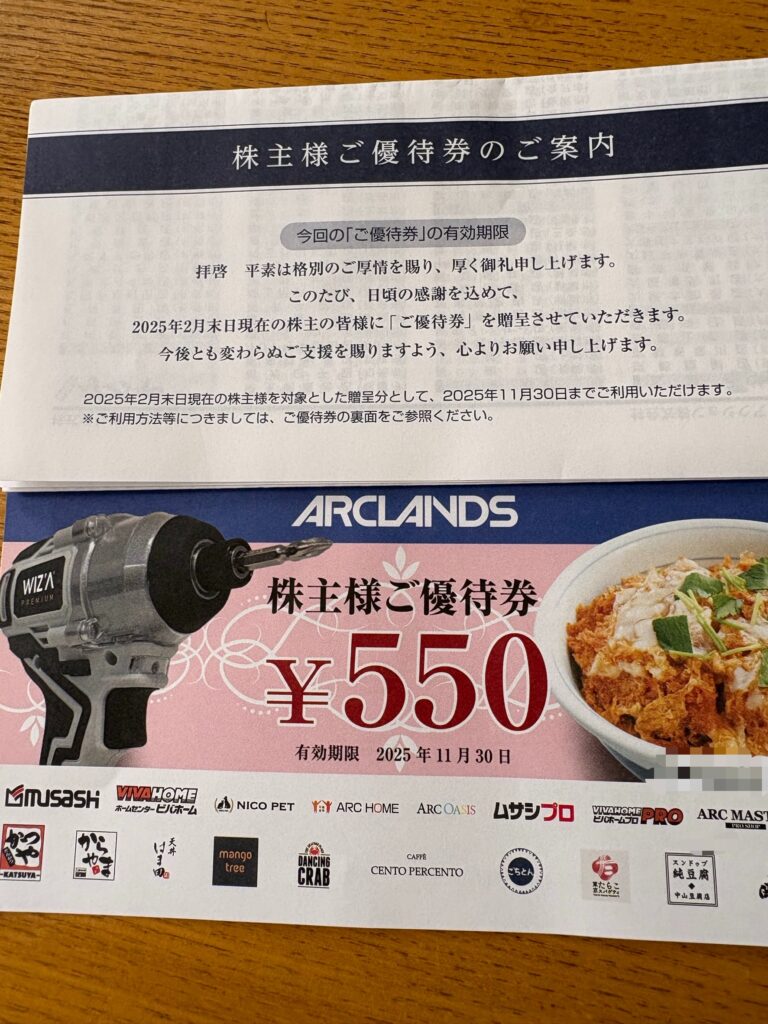 アークランズグループで利用できる株主優待券(550円分)が年2回もらえます。