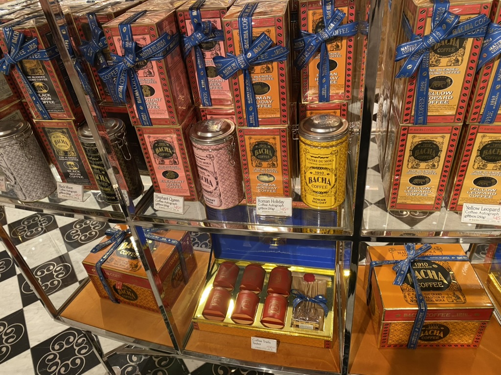 シンガポールの紅茶といえば「TWG」が有名ですが、姉妹店でコーヒーのお店「Bacha Coffee」があっちこっちにできてました。お店が、きらきら光ってて高級感があります。