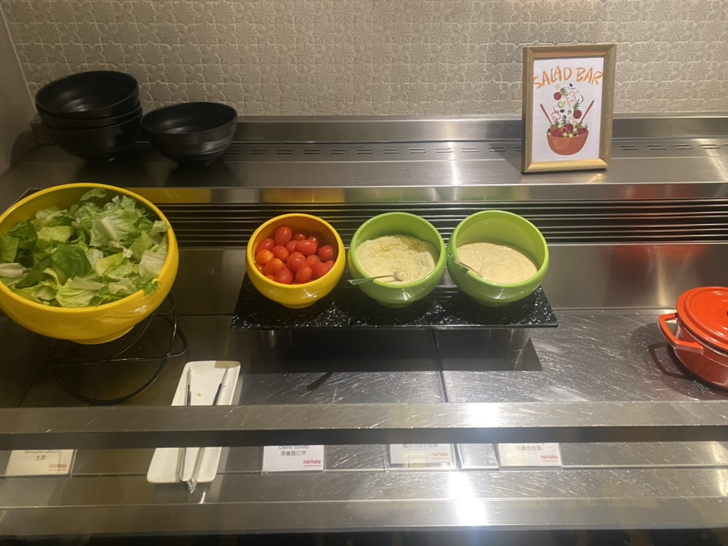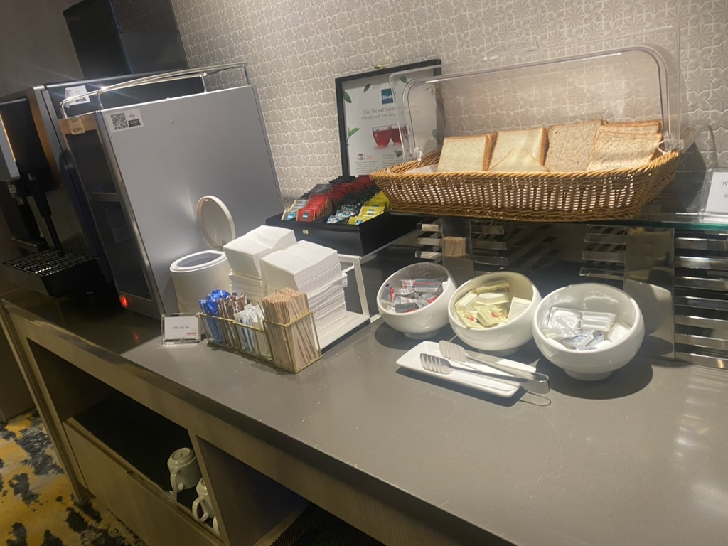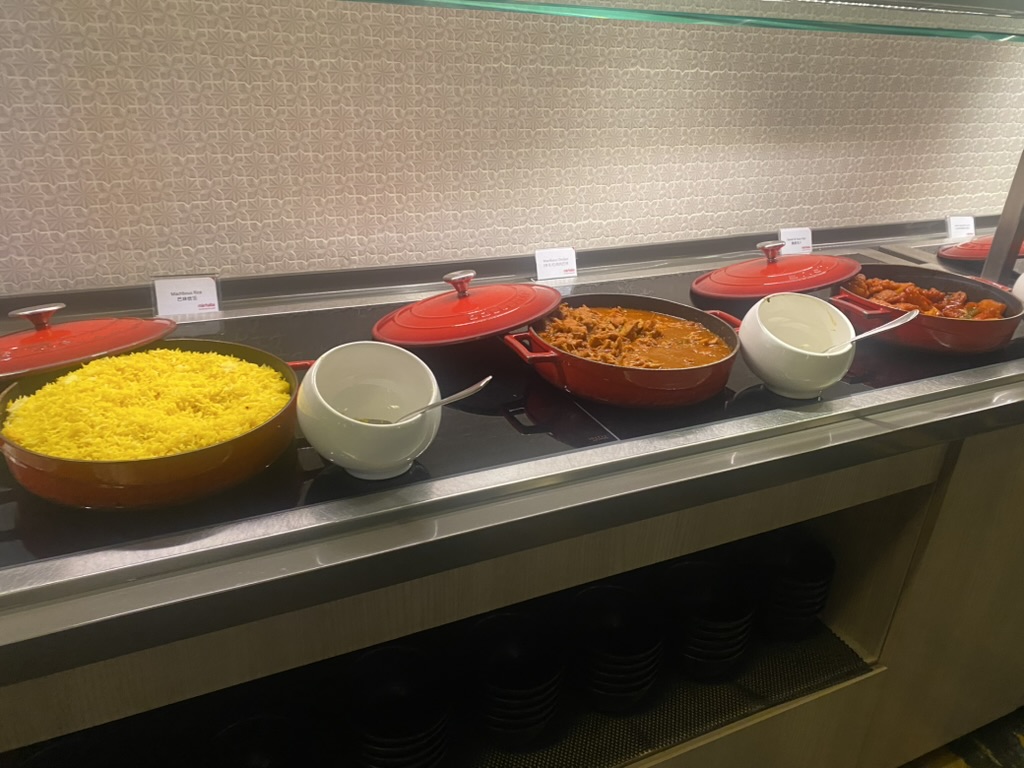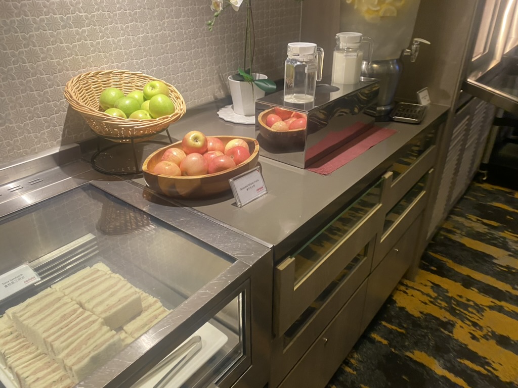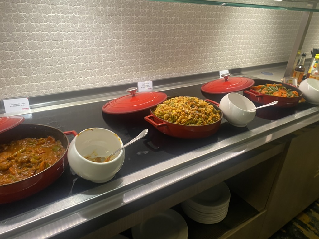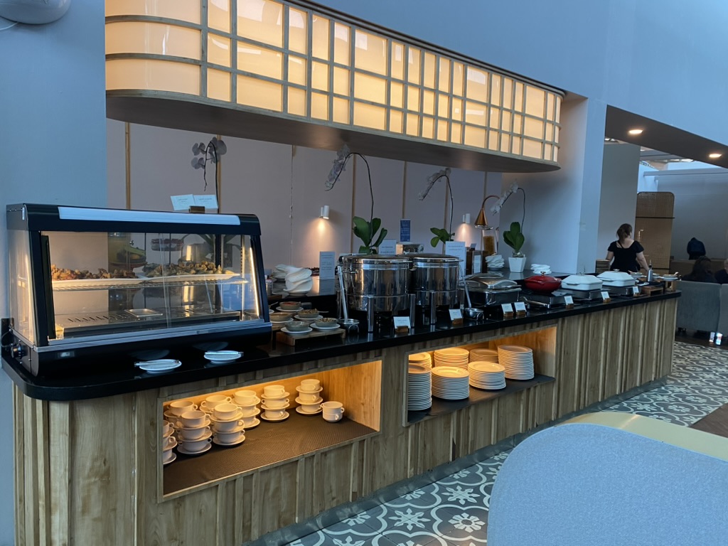 食事は、自分で好きなものを取るスタイルです。まだ、それほどお腹も空いてなかったのでペットボトルの水をいただいて、携帯を充電しながら搭乗時間を待ちます。