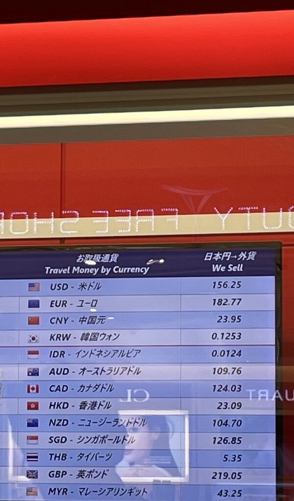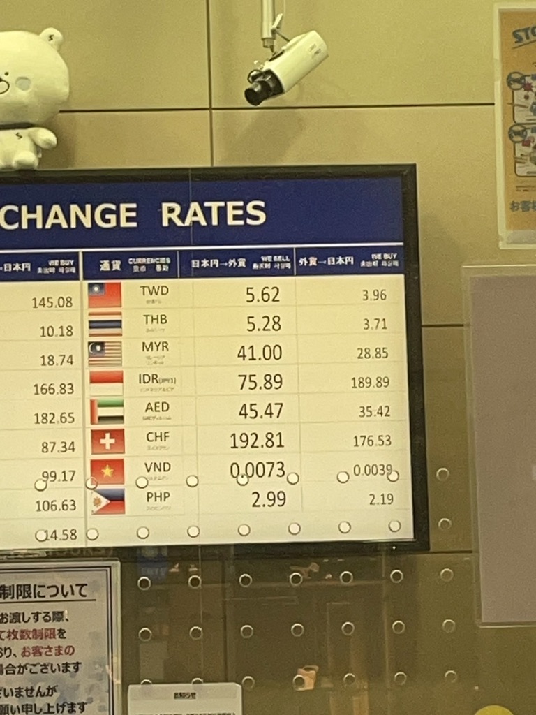 事前に調べた情報では、日本より現地がおすすめとも知ってましたが、時間もあったので15,000円分だけ両替。2ヶ所の両替所を比較しました。表記が違うので分かりにくいですが、左側の方で両替をしました。やっぱり現地で両替した方がレートが良かったようです。