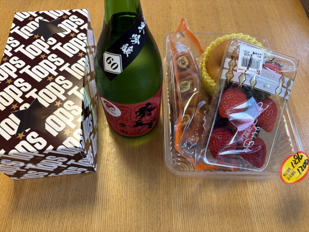 日本酒・フルーツ・トップスのチョコレートケーキを買ってきました。